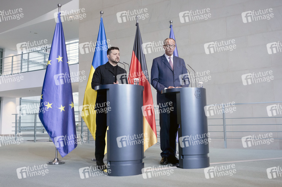 Wolodymyr Selenskyj und Friedrich Merz beim Empfang des Präsidenten der Ukraine mit militärischen Ehren und zu einem gemeinsamen Gespräch mit dem Bundeskanzler mit anschließendem Pressestatement im Bundeskanzleramt. Berlin, 28.05.2025
