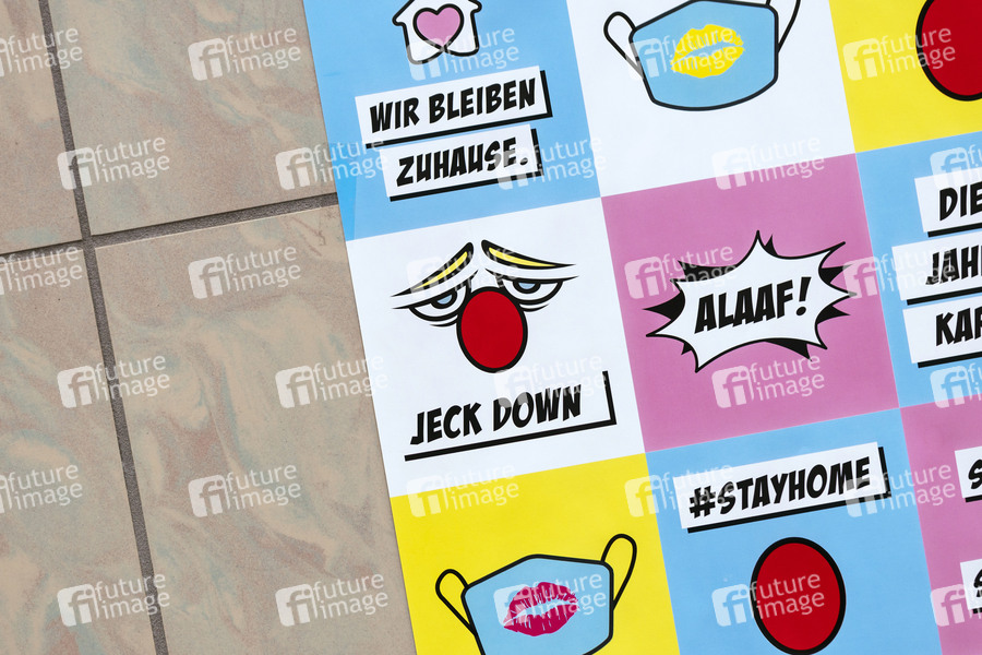 Eine Plakatkampagne stimmt die Kölner darauf ein, an Karneval wegen der Corona-Pandemie zu Hause zu bleiben. An Karneval gilt ein Alkoholkonsumverbot und ein Alkoholabgabeverbot, der traditionelle Rosenmontagszug findet nur virtuell in einer Puppenversion statt. (Themenbild, Symbolbild) Köln, 05.02.2021