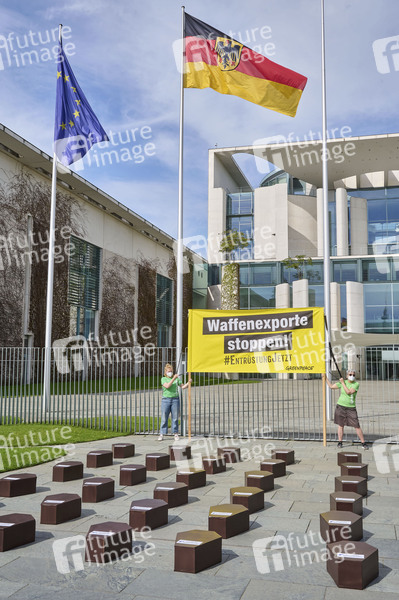 Aktivisten von Greenpeace protestieren mit Särgen vor dem Berliner Kanzleramt gegen die Rüstungsindustrie. Anlass ist die virtuelle Hauptversammlung von Rheinmetall. Berlin, 11.05.2021