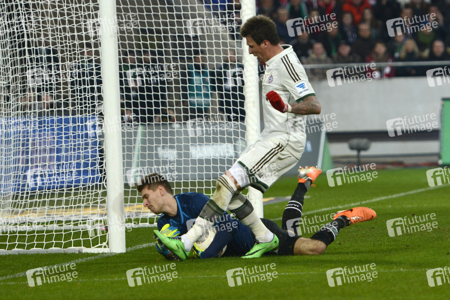 Ron-Robert Zieler und Mario Mandzukic beim Fußball Bundesliga Spiel Hannover 96 gegen FC Bayern München (0:4) in der HDI Arena. Hannover, 23.04.2014
