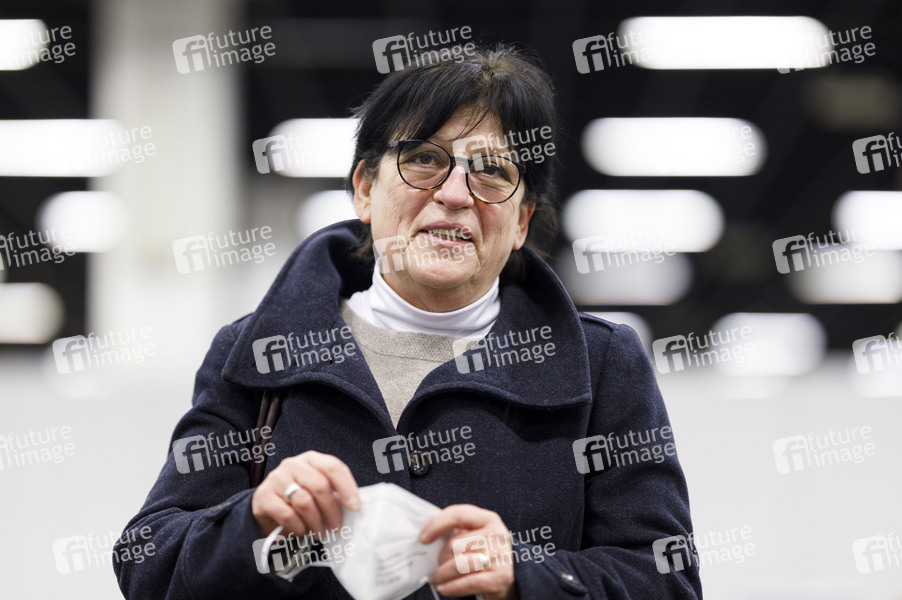 Roswitha Mueller-Piepenkoett auf der Pressekonferenz: Der NRW-Justizminister auf Werbetour in Köln für die Kampagne des Weissen Rings zum Thema 'Kein Anschluss für Betrüger am Telefon' im Impfzentrum in den Messehallen. Auch dort sollen Plakate die alten Menschen vor der Enkeltrick-Masche warnen, die ohnehin die Messehallen für einen Impftermin aufsuchen. Köln, 05.02.2021