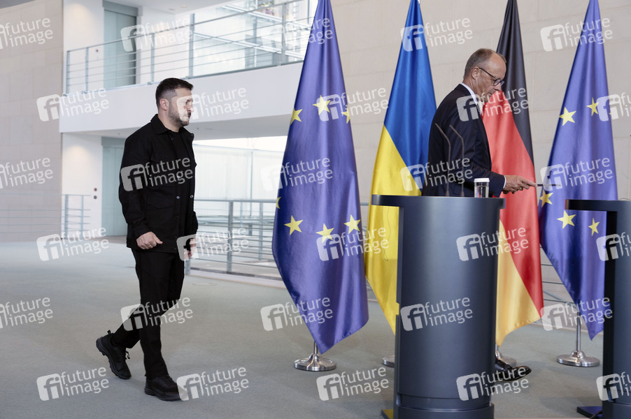 Wolodymyr Selenskyj und Friedrich Merz beim Pressestatement zum virtuellen Treffen zur Ukraine im Bundeskanzleramt. Berlin, 13.08.2025