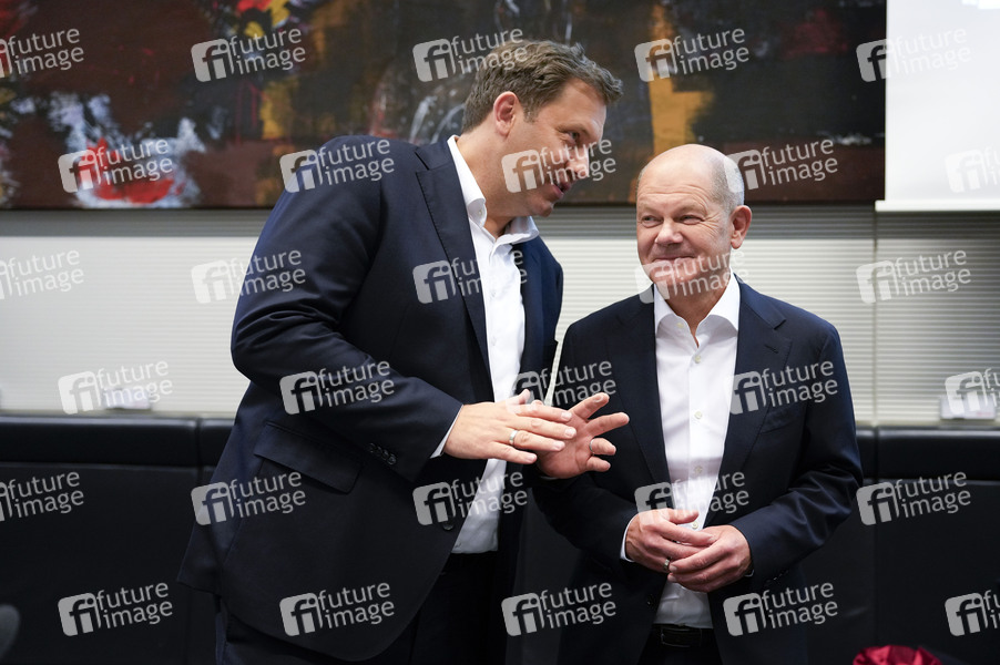 Lars Klingbeil und Olaf Scholz bei der Fraktionssitzung der SPD-Bundestagsfraktion nach dem Ampel-Aus im Reichstagsgebäude. Berlin, 06.11.2024
