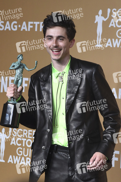 Timothee Chalamet mit dem Preis für den besten Kin-Hauptdarsteller in 'Like a Complete Unknown' beim Preisträger-Photocall der 31. Screen Actors Guild Awards 2025 im Shrine Auditorium and Expo Hall. Los Angeles, 23.02.2025
