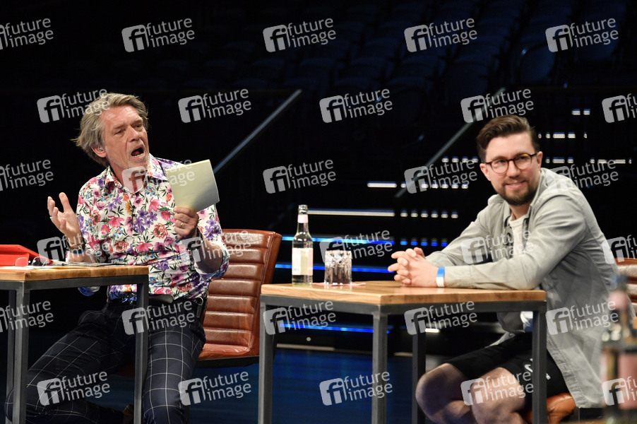 Dr. Hajo Schumacher und Prinz Pi beim Fototermin bei der Pressekonferenz für das Nothilfe-Projekt #hierspieltdiemusik zur Unterstützung der Berliner Musikszene in der Verti Music Hall. Berlin, 10.05.2021