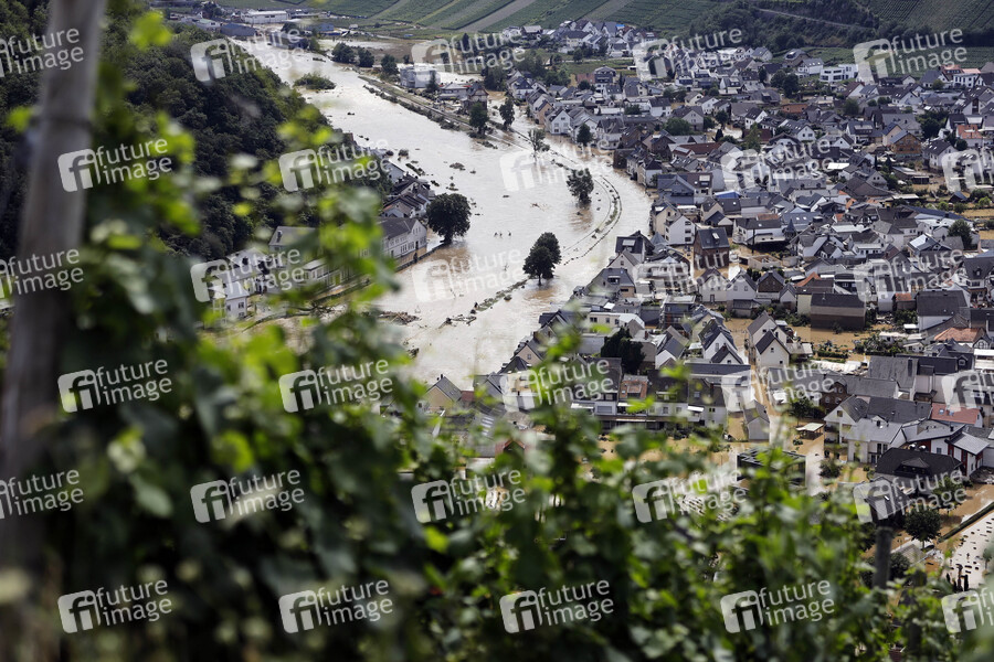 In der Eifel haben heftige Regenfälle und Dauerregen für Überschwemmungen und Überflutungen gesorgt. Im Ahrtal trat der Fluss vielerorts über die Ufer und überschwemmte nicht nur Keller sondern ganze Ortschaften. Im Bild der Ort Dernau (Landkreis Ahrweiler), der beinahe komplett von den Wassermassen geflutet wurde. Viele Menschen verloren alles. Dernau, 15.07.2021