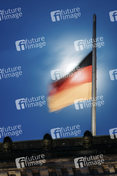 Reichstagsgebäude, Reichstag, Deutschlandfahne, schwatz-rot-gold, Fahne, Flagge, Bundestag, Mond, Gedenktag, Gedenken, Abendstimmung, Blaue Stunde, Trauerbeflaggung, Halbmast, Trauer, Gedenken, Erinnerung, wird vom Innenministern des Bundes oder Länder angeordnet, Symbolfoto, Symbolbild