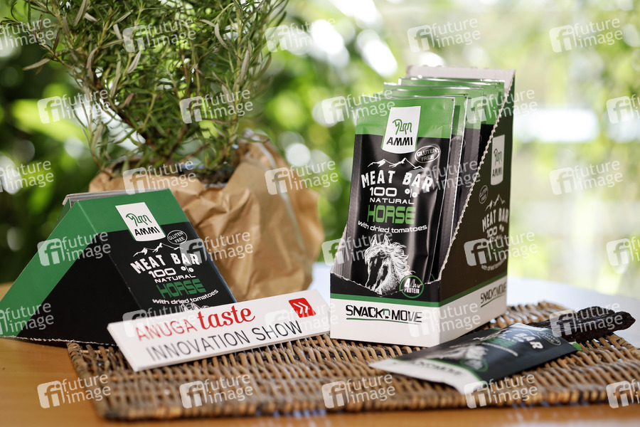 Pferdefleisch-Riegel auf der Lebensmittelmesse Anuga, der weltweit führenden Ernährungsmesse für Handel, Gastronomie und Außer-Haus-Markt, 2021 in der Koelnmesse. Köln, 08.10.2021