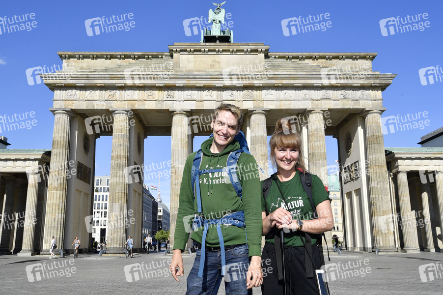 Meik Gudermann und Laura Kuhlen beim Fototermin zur Aktion '750 Kulturkilometer' von Köln nach Berlin am Brandenburger Tor um die Menschen während der Corona-Krise für die aktuelle Problemlage der Kulturlandschaft zu sensibilisieren. Berlin, 23.06.2020