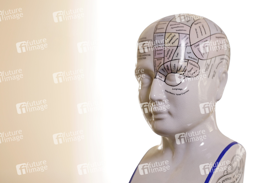 Anatomie, Schädel, Schädellehre, Phrenologie, Phrenology, Büste, Keramik, Kopf, phrenologisch, Physiognomie, Persönlichkeit, Charakter, Geist, Intelligenz, Gemüt, Fähigkeiten, geborene Verbrecher, Homo delinquens, Gehirn, Hirn, Pseudowissenschaft, Physiologie, veraltete Wissenschaften, Wissenschaft, überholte Ansichten, Schädelkunde, Materialismus, Weltbild, Äußeres, äußere Erscheinung, Esoterik, Schädeldeutung, Kopf, Kopfform, Schädelform, Symbolbild, Symbolfoto