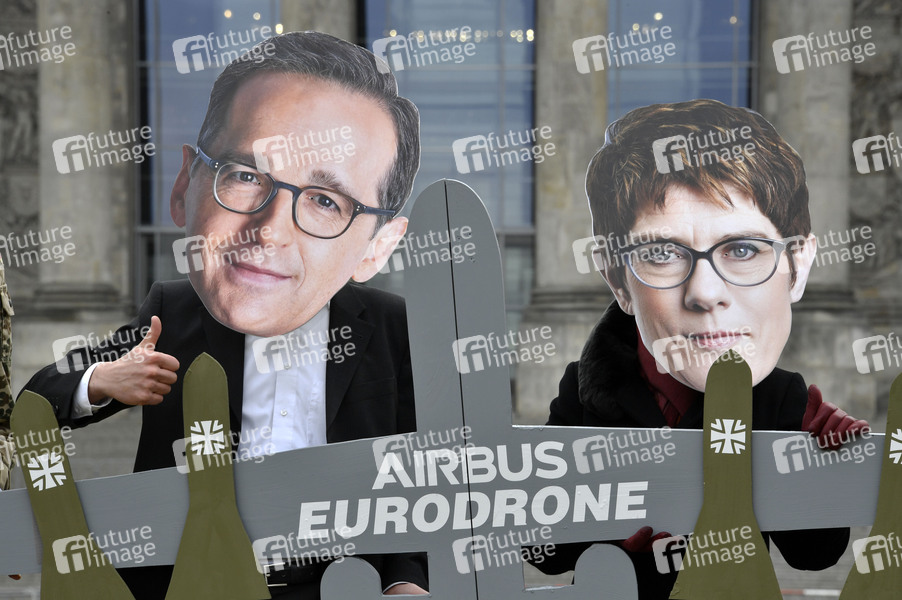 Reichstagsgebäude, IPPNW Deutschland, DFG-VK, Aktion, Demonstration, Abrüstung, Demonstranten, Aktivisten, Protest, Protestaktion, Eurodrohnen, Kampfdrohnen, Masken, Heiko Maas, Annegret Kramp-Karrenbauer