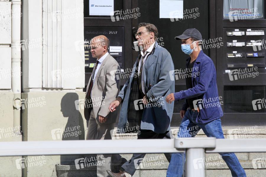 Martin Feifel und Moritz Katzmair bei den Dreharbeiten zum ARD-Fernsehfilm '3 1/2 Stunden' am Set am Bahnhof Görlitz. Görlitz, 09.09.2020