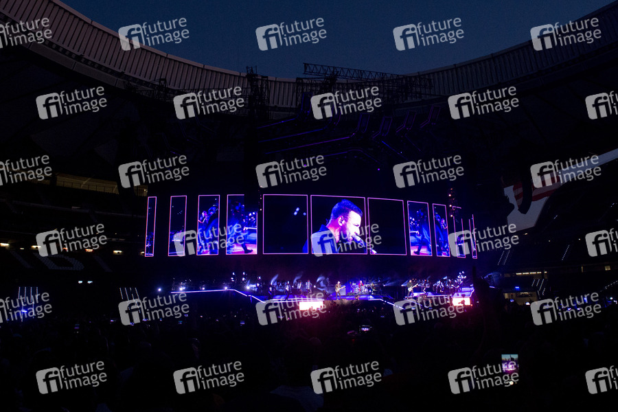 Matthew Bellamy, Dominic Howard und Christopher Wolstenholme von Muse live bei einem Konzert der 'Simulation Theory World Tour' im Wanda Metropolitano Stadion. Madrid, 26.07.2019