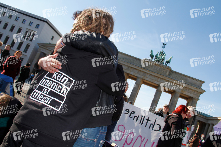 Flüchtlinge und Aktivisten, die vor dem Brandenburger Tor für eine neue Asylpolitik demonstrieren, werden von Politkerinnen der Piratenpartei unterstützt, Berlin