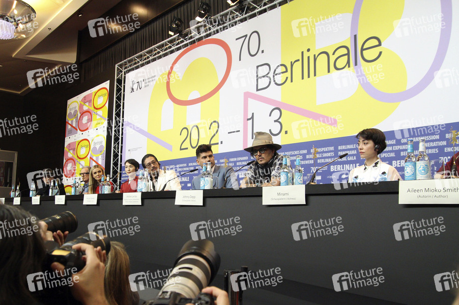 Benoit Delhomme, Bill Nighy, Katherine Jenkins, Akiko Iwase, Hiroyuki Sanada, Andrew Levitas, Johnny Depp und Minami Hinase bei der Pressekonferenz zu 'Minamata' auf der Berlinale 2020 / 70. Internationale Filmfestspiele Berlin im Hotel Grand Hyatt. Berlin, 21.02.2020
