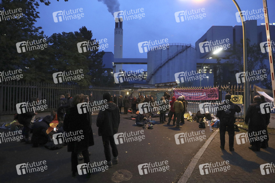 Aktivisten der Umweltschutzgruppe Extinction Rebellion demonstrieren vor dem Vattenfall-Kohlekraftwerk Reuter West. Etwa zehn von ihnen haben sich mit Sekundenkleber am Eingangsgitter festgeklebt. Nach Angaben der Organisatoren handelt es sich um eine schwedische Gruppe XR-Demonstranten. Berlin, 11.10.2019