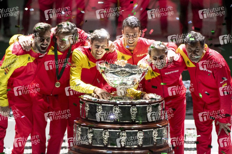 Marcel Granollers, Feliciano Lopez, Pablo Carreno Busta, Roberto Bautista Agut, Rafael Nadal und Sergi Bruguera beim Davis Cup Finale 2019 Spanien gegen Kanada im Sportkomplex Caja Mágica. Madrid, 24.11.2019