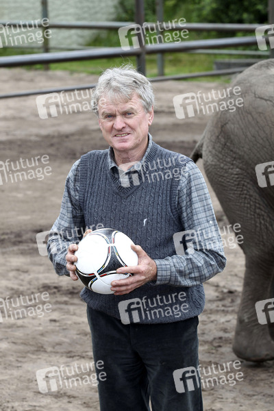 Start der Fan Fun Runde mit Elefantendame Nelly im Serengeti-Park, Hodenhagen. Gemeinsam mit Sepp Maier tippte Sie heute für das erste Spiel der deutschen Fußballnationalmannschaft gegen Portugal