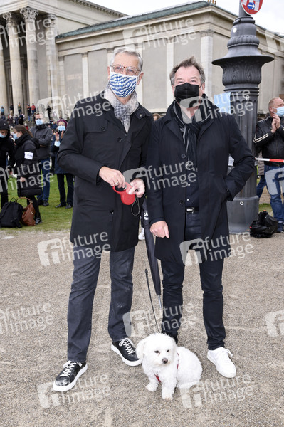 Patrick Lindner mit Ehemann Peter Schäfer und Hund Obelix bei der Kundgebung 'Aufstehen für Kultur' auf dem Königsplatz. München, 24.10.2020