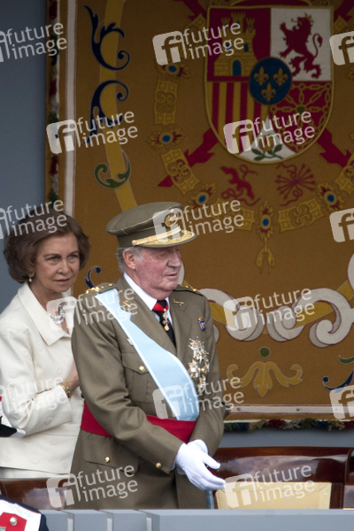 Die spanische Königsfamilie bei der Hommage an die Nationalflagge mit Militärparade am Palacio Real, Madrid