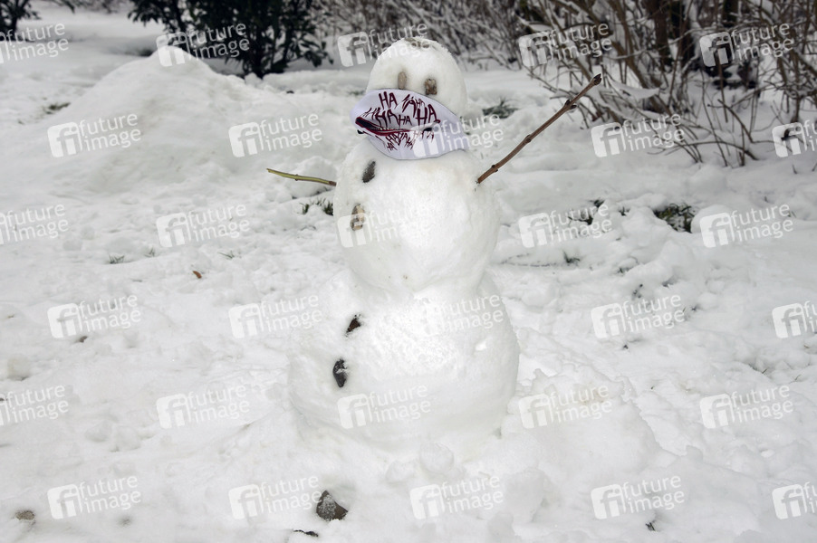 Schneemann mit Joker-Mundschutz zum Wintereinbruch. München, 06.01.2020