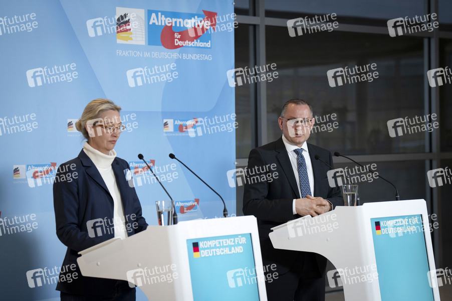 Alice Weidel und Tino Chrupalla beim Pressestatement zur Fraktionssitzung der AfD-Bundestagsfraktion im Reichstagsgebäude. Berlin, 12.03.2025