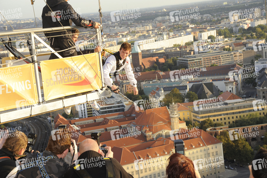 Base Flying von Jochen Schweizer mit den Hauptdarstellern von 'Gangs' auf dem Park Inn Hotel am Alexanderplatz in Berlin