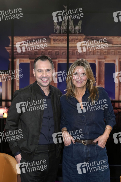 Sebastian Fitzek und Kim Fisher bei der Aufzeichnung der MDR/rbb-Talkshow 'Riverboat' im Studio A im rbb Fernsehzentrum. Berlin, 15.10.2021
