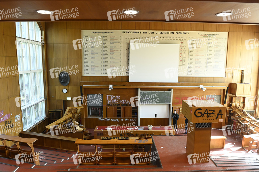 Nach einer Besetzung des Emil-Fischer-Saals der Humboldt-Universität durch propalästinensische Aktivisten die durch die Polizei geräumt wurde, sind offenbar so umfangreiche Schäden entstanden, dass der Raum nicht mehr nutzbar ist. Berlin, 22.04.2025