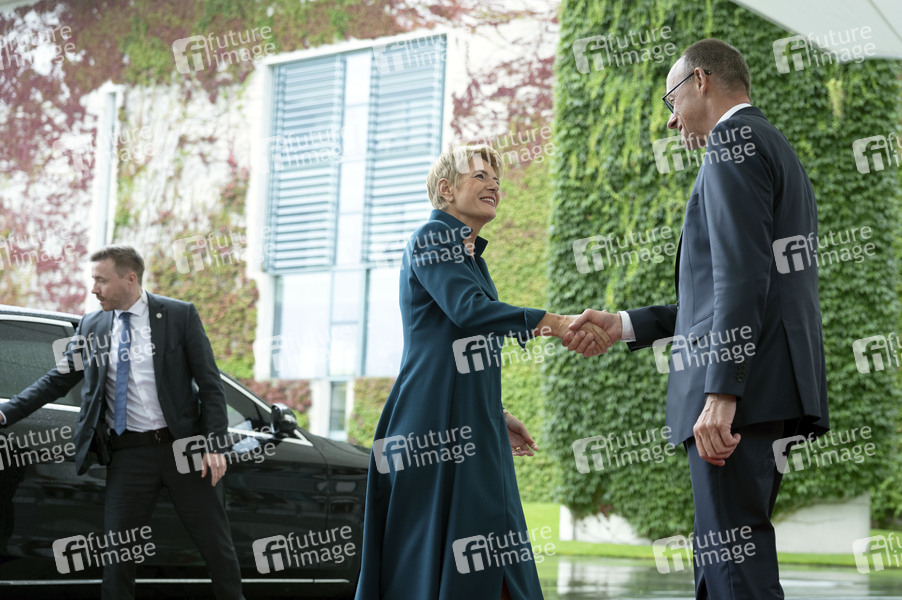 Karin Keller-Sutter und Friedrich Merz beim Empfang der Bundespräsidentin der Schweiz mit militärischen Ehren zu einem gemeinsamen Gespräch mit anschließendem Pressestatement im Bundeskanzleramt. Berlin, 02.09.2025