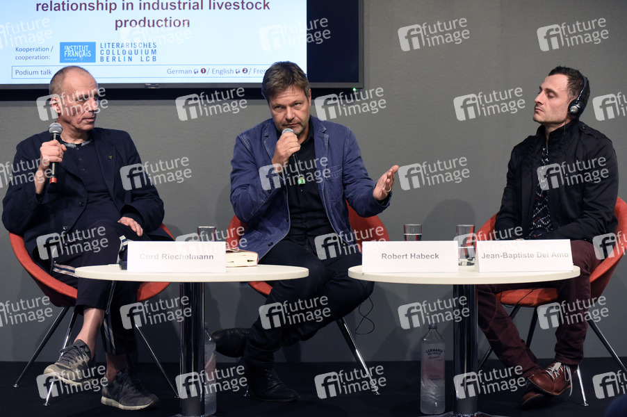 Cord Riechelmann, Roland Habeck und Jean-Baptiste Del Amo bei der Podiumdiskussion 'Kranke Haltung: Das Mensch-Tier-Verhältnis in der industriell betriebenen Zucht' auf der 71. Frankfurter Buchmesse 2019 auf der Messe Frankfurt. Frankfurt am Main, 16.10.2019