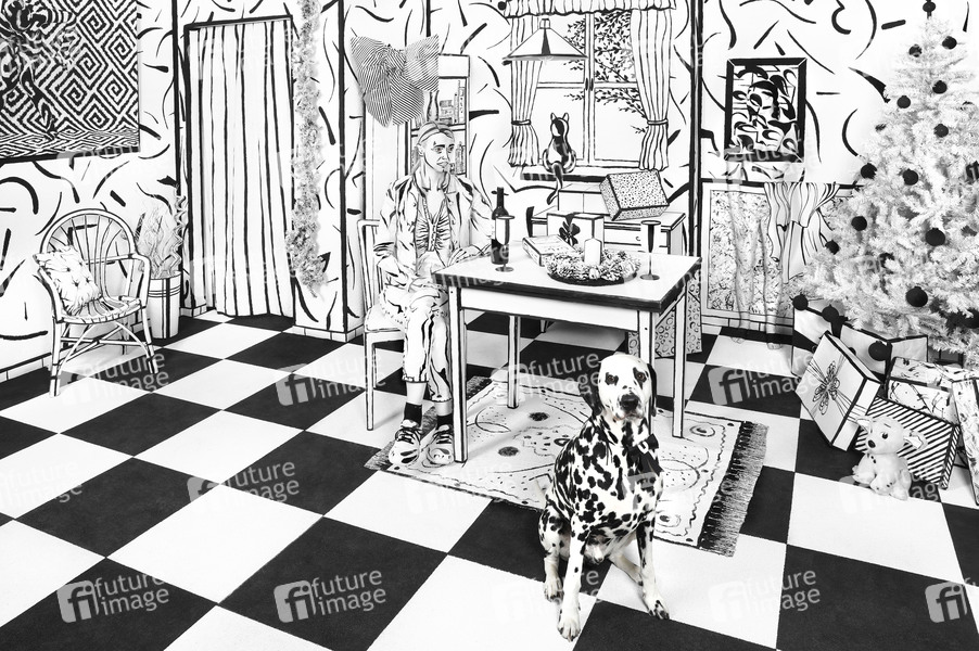 (Black and) White Christmas Photoshooting mit den Models Tina als Akteurin, Tatjana Heinz getarnt am Bilderrahmen und Hund Diego im Atelier Düsterwald. Hameln, 08.12.2024 - Bodypainting und Kulisse von Jörg Düsterwald