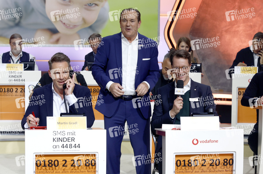 Martin Gradl, Wolfram Kons und Hendrik Wüst beim 30. RTL-Spendenmarathon 2025 im Studio 8 der EMG Studios. Hürth, 21.11.2025