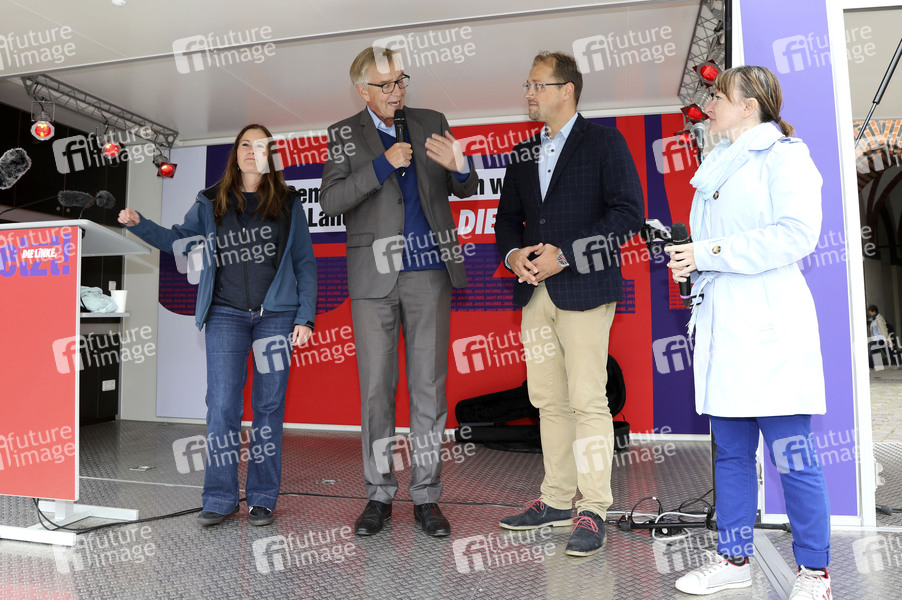 Janine Wissler, Dietmar Bartsch, Sebastian Lange und Olga Fot bei der Städtetour der Partei Die Linke zur Bundestagswahl 2021 mit dem Motto 'Sozial gerecht. Vor Ort. Jetzt!' auf dem Alten Markt. Stralsund, 28.08.2021