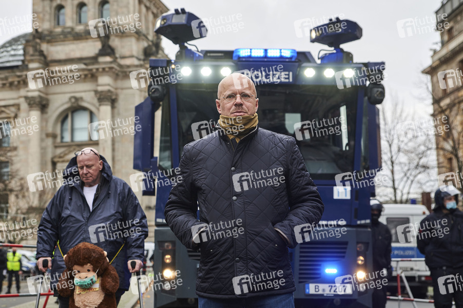 Andreas Kalbitz (rechtsextremer Politiker, parteilos, zuvor AfD, Die Republikaner und CSU) - Tausende Demonstranten protestieren am Brandenburger Tor und im Regierungsviertel gegen die Corona-Politik der Regierung anlässlich der Bundestagsitzung zum Infektionsschutzgesetz. Die Polizei löst den Protest auf. Dabei kommt es zu Festnahmen, dem Einsatz von Wasserwerfern und Verstößen gegen die Maskenpflicht. Proteste in unmittelbarer Nähe des Bundestags waren zuvor untersagt worden. Berlin, 18.11.2020