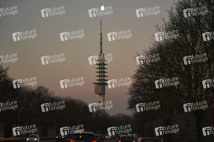 Der Mond über dem Telemax Hannover während des morgendlichen Berufsverkehrs auf dem Messeschnellweg. Hannover, 03.03.2021
