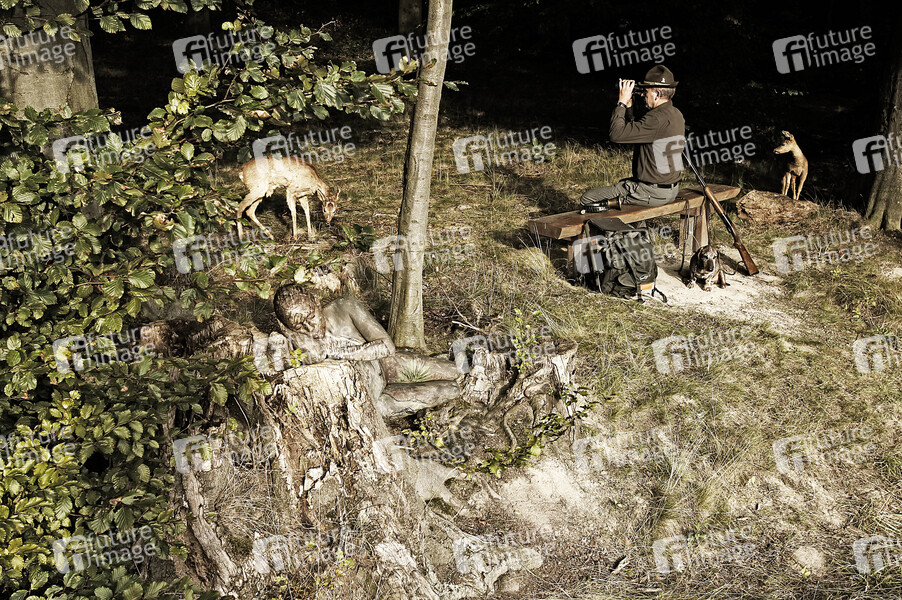 Bodypainting, Body-Painting, Erotik, Frau, Mädchen, nackt, Akt, weiblich, Körperkunst, Körperfarben, Farbe, Bemalung, Kunst, Malerei, Wald, Jäger, Reh, Hund, Dackel, Jagd, Natur, Baumwurzel, Baumstumpf, draußen, body painting, erotic, woman, girl, nude, female, body art, colors, forest, hunter, deer, dog, dachshund, hunting, nature, tree root, stump, outside, Joerg Duesterwald
