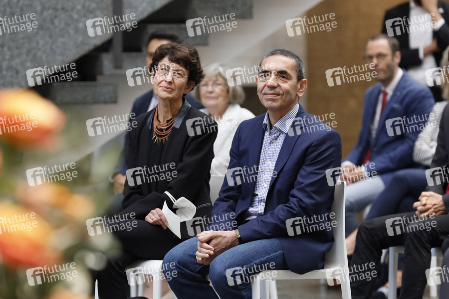 Özlem Türeci und Ugur Sahin, die Gründer des Biotechnologie-Unternehmens Biontech, bei der Verleihung der Ehrendoktorwürde der Medizinischen Fakultät der Uni Köln und der Eintragung ins Goldene Buch der Stadt Köln. Köln, 17.09.2021