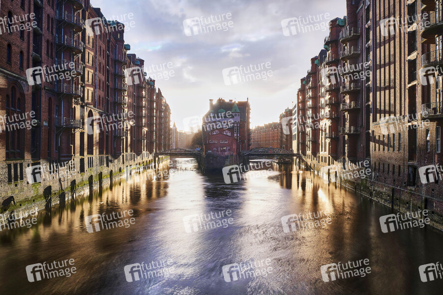 Teekontor im Wasserschloss fotografiert von der Poggenmühlenbrücke in der Speicherstadt. Hamburg, 03.03.2020