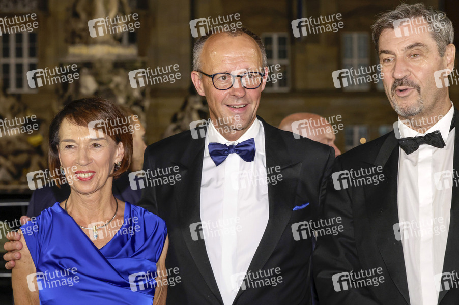 Friedrich Merz mit Ehefrau Charlotte Merz und Markus Söder beim Staatsempfang nach der Eröffnung der 113. Richard-Wagner-Festspiele 2025 mit der Neuinszenierung von 'Die Meistersinger von Nürnberg' im Neuen Schloss Bayreuth. Bayreuth, 25.07.2025