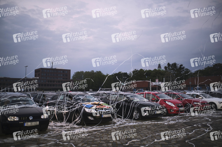 Publikum beim Robin Schulz Autokultur-Konzert auf dem Schützenplatz. Die Besucher verfolgen unter Berücksichtigung klarer Hygiene-Vorschriften während der Corona-Krise den Auftritt aus dem Auto. Hannover, 16.05.2020