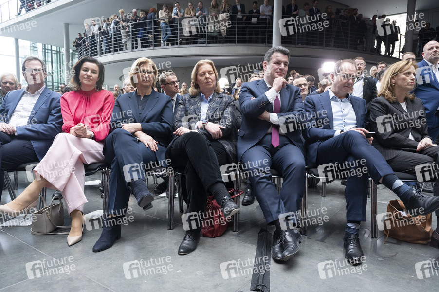 Dorothee Bär, Anke Rehlinger, Bärbel Bas, Hubertus Heil und Alexander Dobrindt bei der Pressekonferenz von CDU, CSU und SPD zur Vorstellung des gemeinsamen Koalitionsvertrages im Paul-Löbe-Haus. Berlin, 09.04.2025