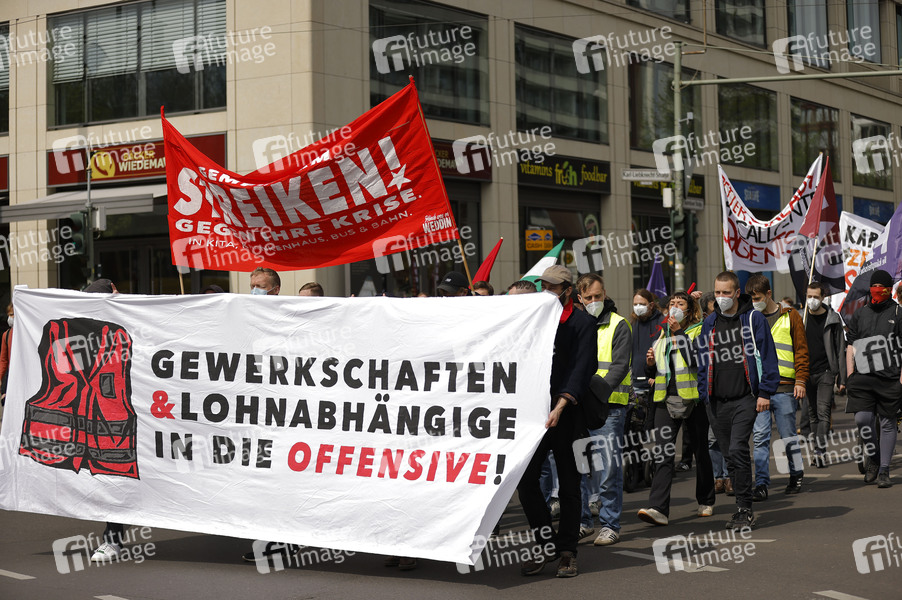 Sozialistische Demo am Hackeschen Markt. Etwa 800 Personen demonstrieren in Mitte unter dem Motto 'Nicht auf unserem Rücken - Gewerkschaften und Lohnabhängige in die Offensive!'. Die Demo begann an der DGB-Zentrale und endete mit einer Kundgebung am Roten Rathaus. Berlin, 01.05.2021
