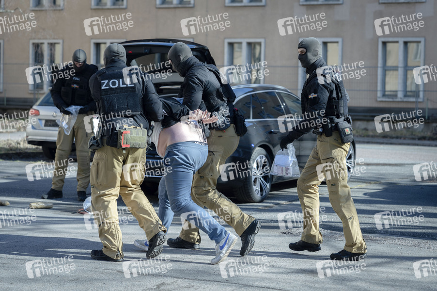 Vorführung eines Zugriffs durch Zoll-Einsatzkräfte nach der Pressekonferenz zur Vorstellung des Aktionsplans gegen Organisierte Kriminalität im Zollfahndungsamt Berlin-Brandenburg. Berlin, 25.02.2026