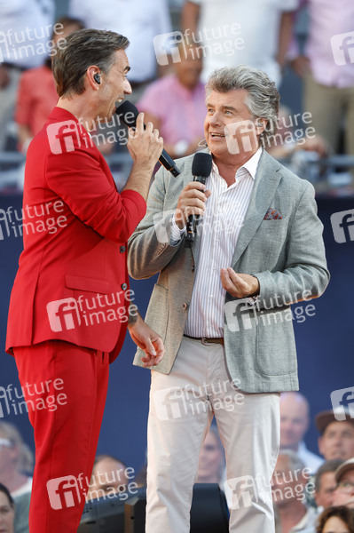 Florian Silbereisen und Andy Borg in der TV-Show 'Schlagerbooom Open Air 2025 - Die Berge leuchten!' live aus dem Stadion Kitzbühel. Kitzbühel, 21.06.2025