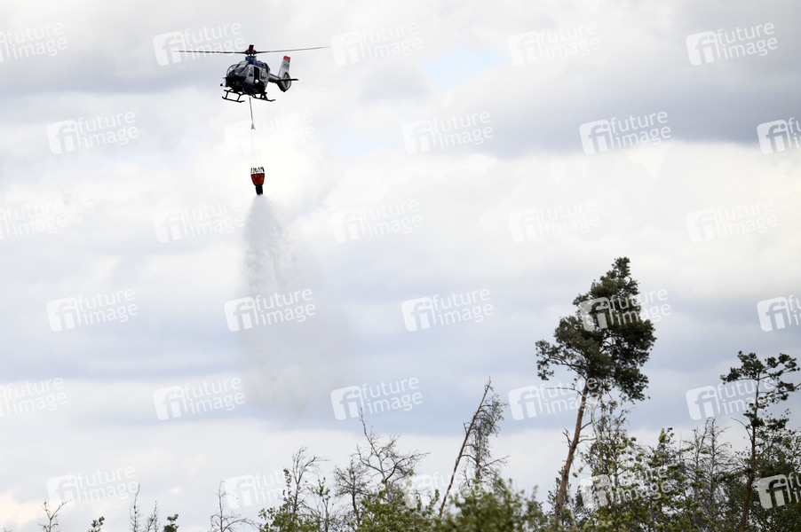 Löschhubschrauber der Polizei beim Pressetermin in der Gohrischheide, wo es seit dem 1. Juli brennt. Derzeit wird von einer vom Brand betroffenen Fläche von etwa 2.100 Hektar ausgegangen. Aktuell befinden sich etwa 600 Kräfte von der Freiwilligen Feuerwehr, dem Technischen Hilfswerk, der Bundeswehr, der Polizei und anderen Organisationen in den fünf Einsatzabschnitten im Einsatz. Im Einsatzabschnitt Jacobsthal ist die Lage stabil. Es gilt weiterhin eine Ausbreitung des Brandgeschehens Richtung Süden zu verhindern sowie den alten Sprengplatz und die Ortschaft zu schützen. Jacobsthal, 07.07.2025