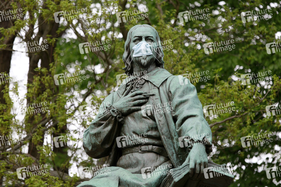 Die Statue des Philosophen Jakob Böhme mit Mund-Nasen-Schutz im Park des Friedens. Görlitz, 30.04.2020