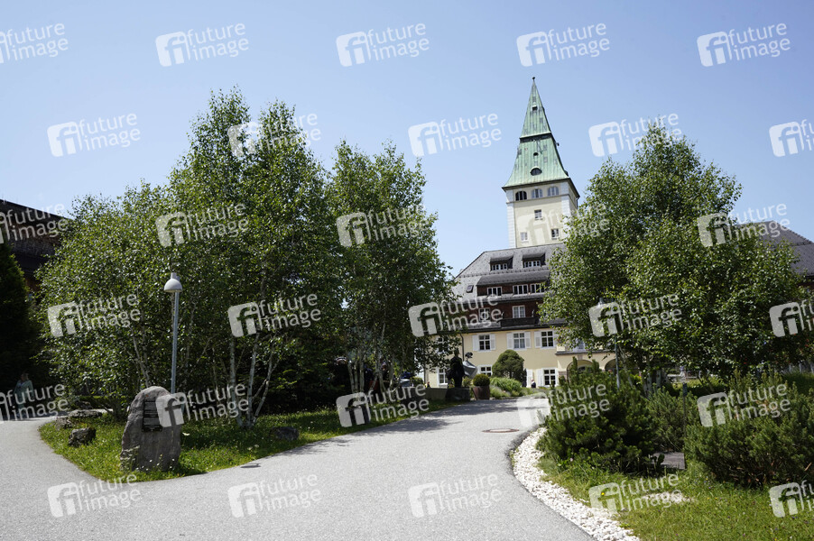 Schloss Elmau beim Fototermin zum erweiterten Familienfoto im Rahmen der Outreach-Arbeitssitzung am zweiten Tag des G7-Gipfels. Die Staats- und Regierungschefs der G7-Gruppe kommen offiziell unter dem Motto 'Fortschritt hin zu einer gerechten Welt' zusammen und werden globale Themen wie Krieg, Klimawandel, Hunger, Armut und Gesundheit diskutieren. Der Gipfel wird vom anhaltenden russischen Krieg gegen die Ukraine überschattet. Klais, 27.06.2022