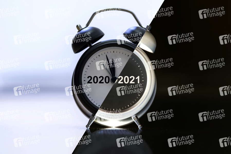 2021, Feiertage, Fest, Glück, Silvester, Neujahr, Frohes Neues Jahr, Hoffnung, Uhr, Wecker, Symbolbild, Symbolfoto, Fotomontage