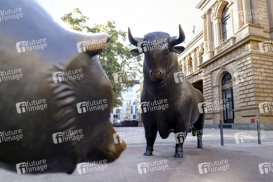 Bulle und Bär vor der Frankfurter Wertpapierbörse, wo es am Montag zu einem extremen Kurssturz kam. Bullenmarkt oder Hausse steht an der Börse für anhaltend steigende Kurse und Bärenmarkt oder Baisse für anhaltend sinkende Kurse. Frankfurt, 09.03.2020